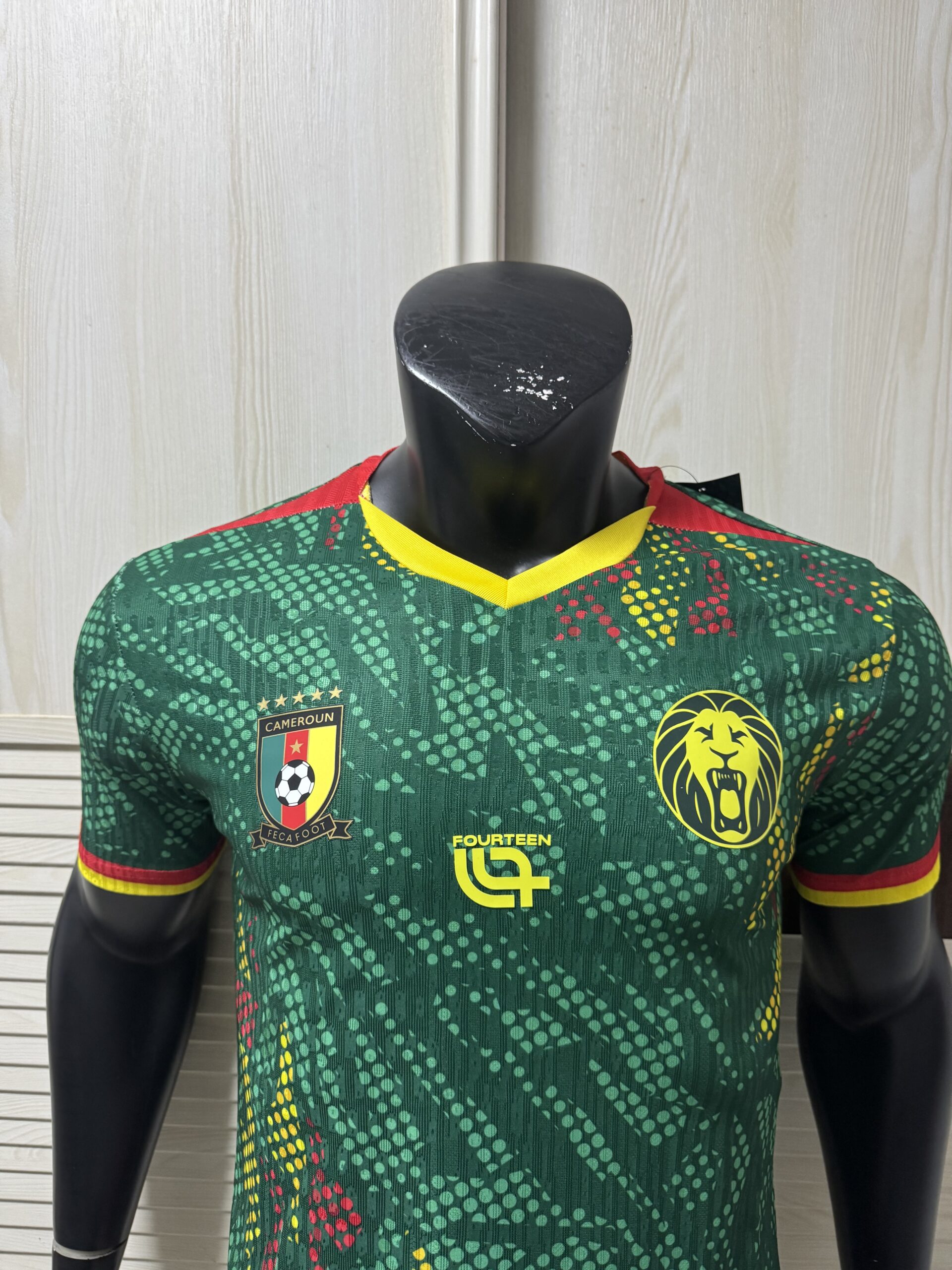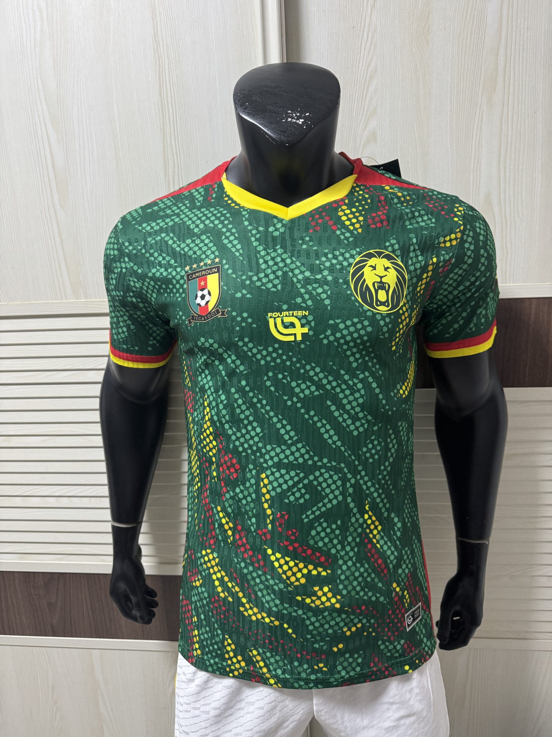 The home kit showcases Cameroon’s traditional green colour scheme with a tonal lion graphic subtly embedded in the fabric, creating a dynamic visual effect across the front. Yellow v-neck collar trim and sleeve cuffs feature red and green striping representing the national colours. FOOTBALL FASHION The shirt displays the Cameroon Football Federation crest with five stars on the left chest — representing the nation’s five Africa Cup of Nations titles — the Fourteen logo in the centre, and a roaring lion emblem on the right. FOOTBALL FASHION